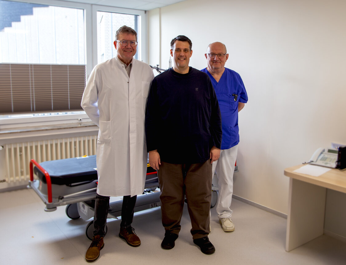 Chefarzt Dr. Florian Dietl (links) und Harry Feist (leitender Oberarzt und Zentrumschirurg) freuen sich über die erfolgreiche Behandlung von Henrik Seltenheim (Mitte).