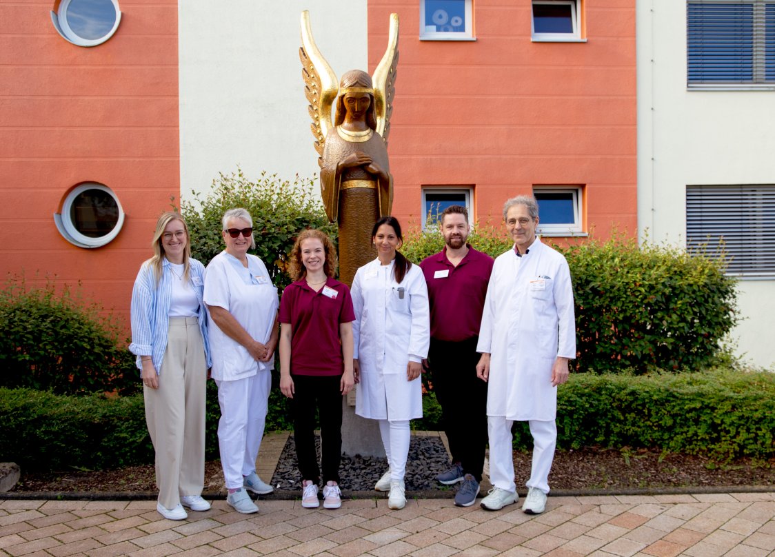 Das Team rund um Dr. Josef Nelles (rechts im Bild) freut sich über die neuen Maßnahmen und die Teilnahme am Schmerzregister von links: Nicole Wiechers (Psychologin), Renate Böhner (Gesundheits- und Krankenpflegerin), Karina Stamm (Physiotherapeutin), ltd. Oberärztin Dr. Indira Ruch und Jeroen Saurgnani (Physiotherapeut).